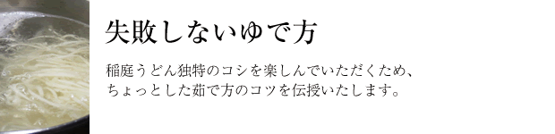 ゆで時間は約3分半。長くゆで過ぎると風味もコシも無くなりますので注意。うどんが半透明になってきたら、ざるに上げましょう。